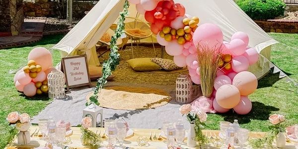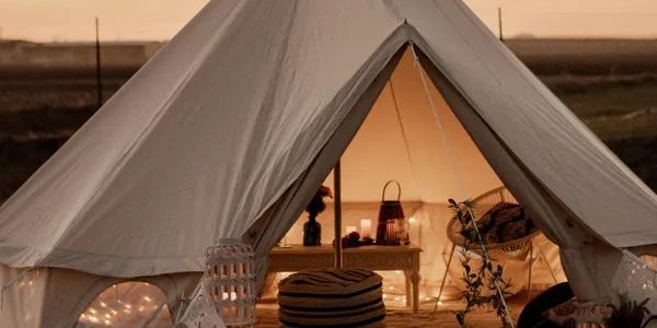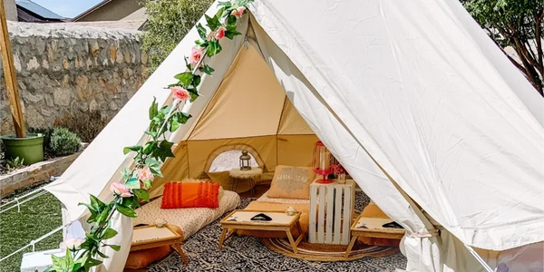 Our Exclusive Bell Tent sleeps four very comfortably. Comes with four memory foam mattresses complete with bedding. Breakfast trays with personalized sleep eye masks, and styling elements to fit your theme/colors.